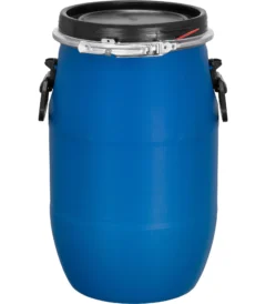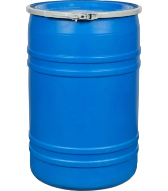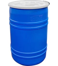 30 Gallon Blue Plastic Open Head Drum, UN Rated, Natural Cover w/Lever Lock Ring, 2″ & 3/4″ Fittings
