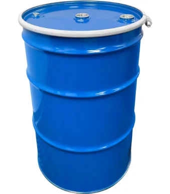55 Gallon Steel Drum, Blue, UN Rated, Unlined, Blue Cover w/Bolt Ring, Two 2″ Fittings & One 3/4″ Fitting