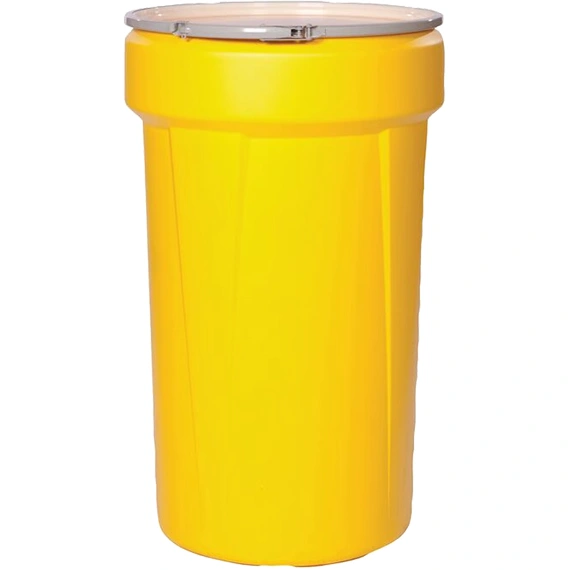 55 Gallon Yellow Plastic Drum, UN Rated, Cover w/Metal Lever Lock