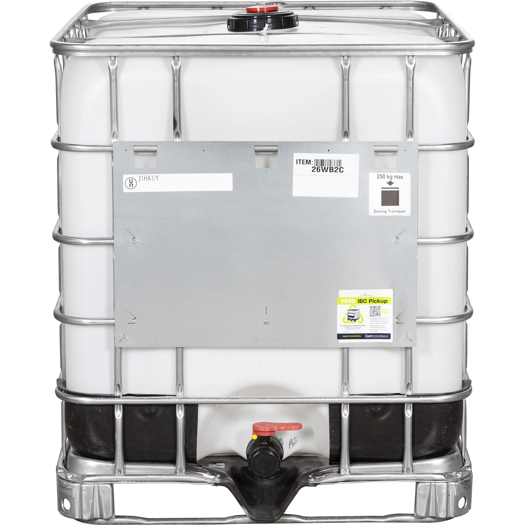 The 26WB2C is a rebottled 275 gallon IBC with a 2″ Camlock valve. Also known as an intermediate bulk container, IBC tank, or IBC tote, this industrial container holds the same capacity as five 55-gallon drums in less space and features a 2″ Camlock valve allowing for easy disconnect, adding to ease of use. Camlock is usually used for quick connects (like hoses), while NPT is for threaded connections. This rebottled IBC has an EPDM gasket in the discharge valve. The 26WB2C has three components: a new bottle, reconditioned cage, and a reconditioned steel/composite pallet. The 26WB2C features a 6″ top screw cap, EPDM gaskets, and 4 HDPE corner protectors and has a UN rating of UN31HA1/Y. The placard may be plastic, metal, or corrugated cardboard, depending on material availability.