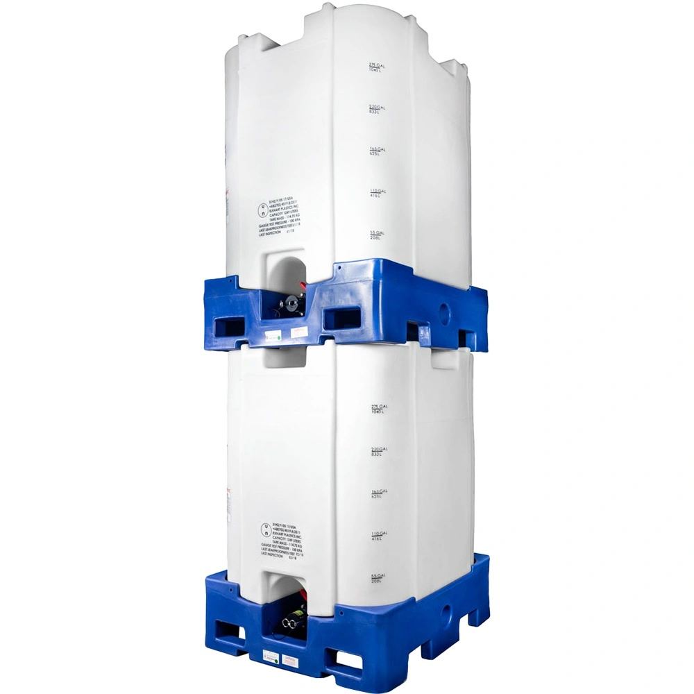 This heavy-duty 275 gallon plastic IBC tote boasts a cageless design for optimal performance and transportation. The tote has a 2″ PP Tuff LinQ™ Valve with integrated male camlock and a dust cap, a 6″ Fill Cap with a 2″ NPS port, a 2″ Pressure/Vac relief vent in the fill lid, as well as two 2″ NPS Adapters with 2″ bung plugs. The valve, fill cap, vent, and bung plugs all have EDPM gaskets. This tote has an anti-teeter blue base with four-way forklift and two-way pallet jack entry for easy transportation. Its stackable design is excellent for food and chemical markets, featuring molded in-volume markers to easily track capacity. The tote is UN Rated UN31H2/Y.