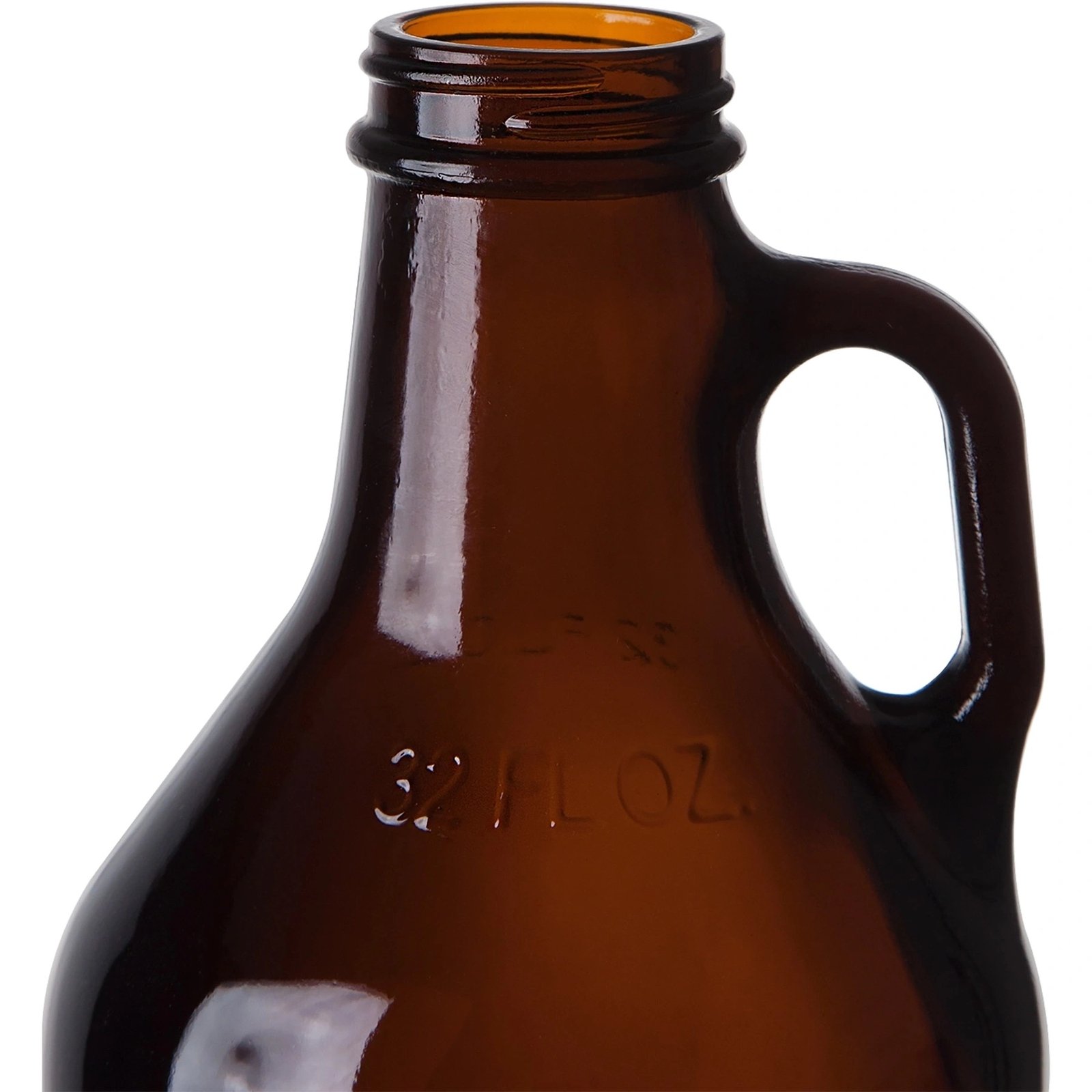 The 32 ounce beer growler uses a standard screw top closure and is made in the U.S. with amber glass and a flat bottom.
