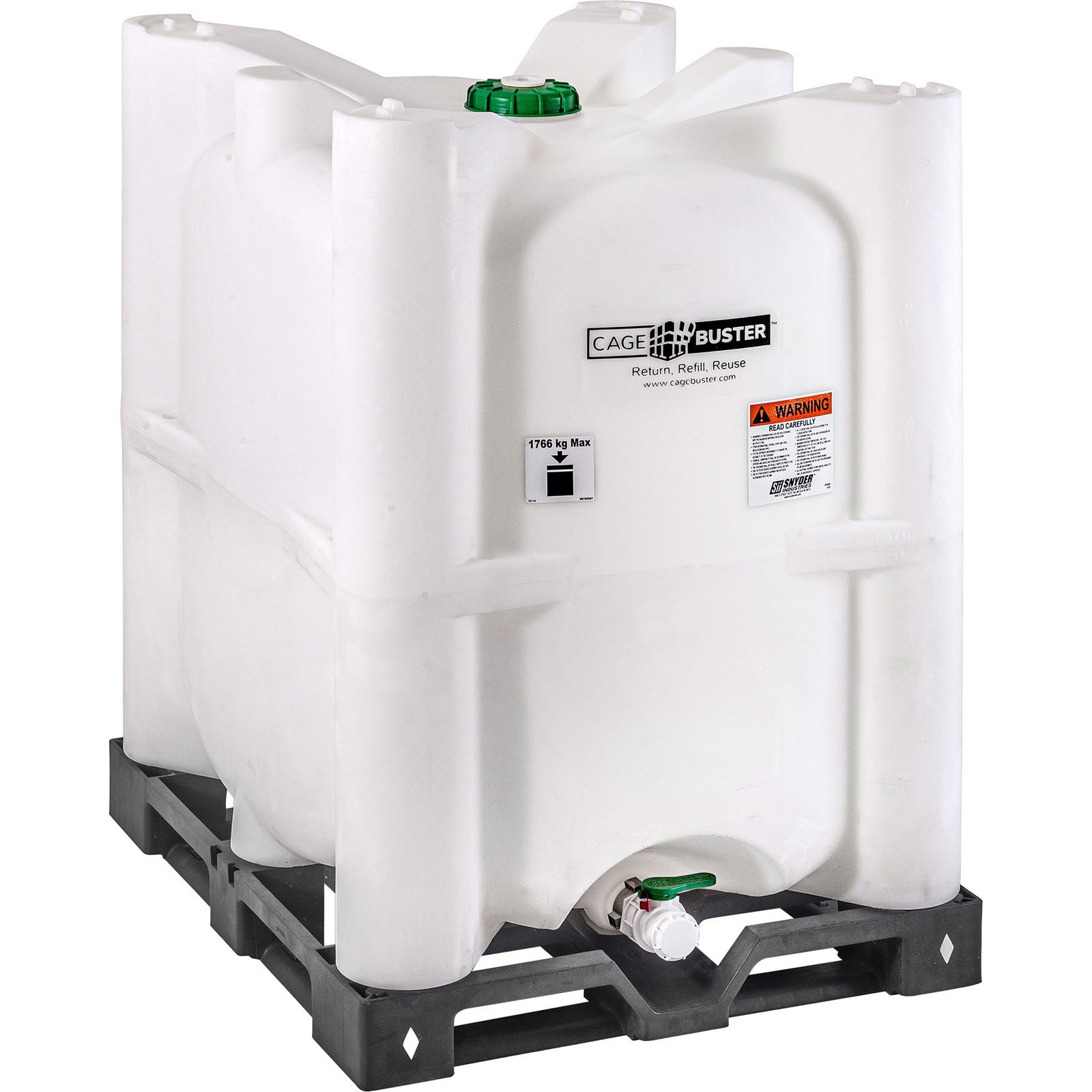 The new 330 gallon Cagebusterâ„¢ Plastic IBC Tote consists of a 100% recyclable HDPE tank, 100% recycled black plastic pallet, 5-5/8″ green lid w/ plug, and 2″ ball valve w/ EDPM gasket. It is UN Rated (UN 31H2/Y) for the transportation of packing group II and III hazardous materials. Experience the superior strength of this tote’s castle structure, resistant to warpage and liquid pooling. Design benefits include: curved side walls for easy access to the tote’s top parts, thicker container walls to protect against forklift damage, an innovative stacking lug, and a sloped drain trough for faster draining. This all-plastic tank is free of the corrosion and chemical attacks associated with metal cages, boasting easy exterior cleaning instead. Additionally, this tote’s pallet provides a robust, versatile IBC base that is conveyor friendly and includes an anti-skid feature to prevent sliding.